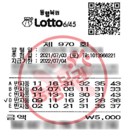 로또 당첨 번호 3개 맞으면 5000원 당첨금 받는 5등에 당첨되어 기분 좋은 주말을 보내게 됩니다. 복권판매점 가서 공짜로 5개 게임 로또복권으로 바꾸게 되죠