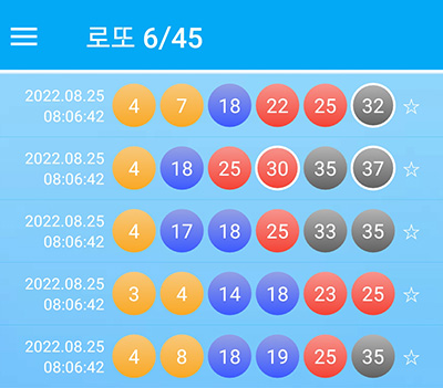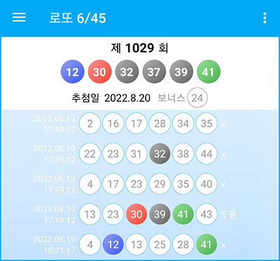 지난주 로또 645 무료앱으로 로또예상번호 받았을 때 1등 당첨번호와 모두 5개 일치 되었습니다.