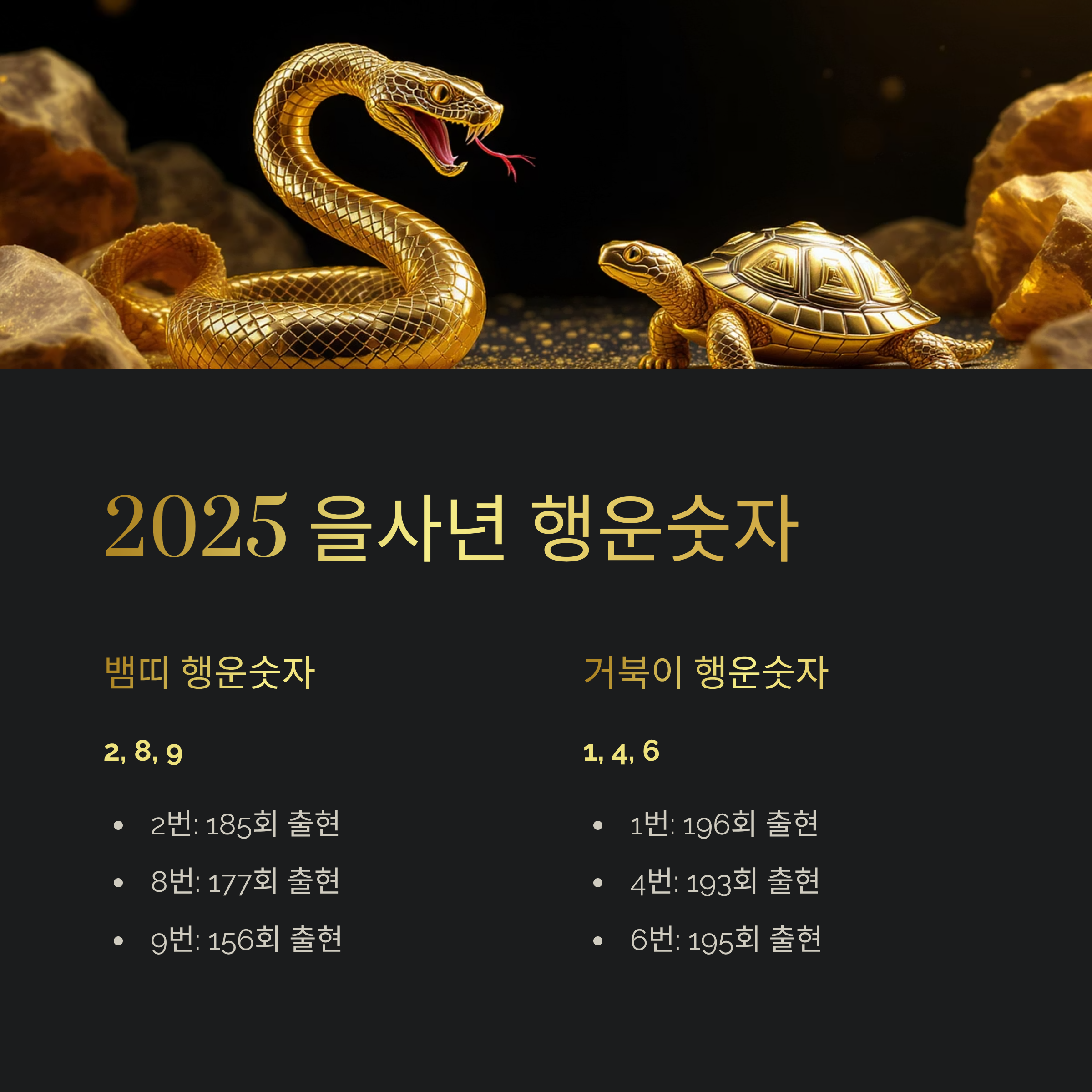 2025년은 을사년 뱀띠 해라서 로또번호 1201회 뱀 거북이 행운숫자도 함께 살펴봤습니다.